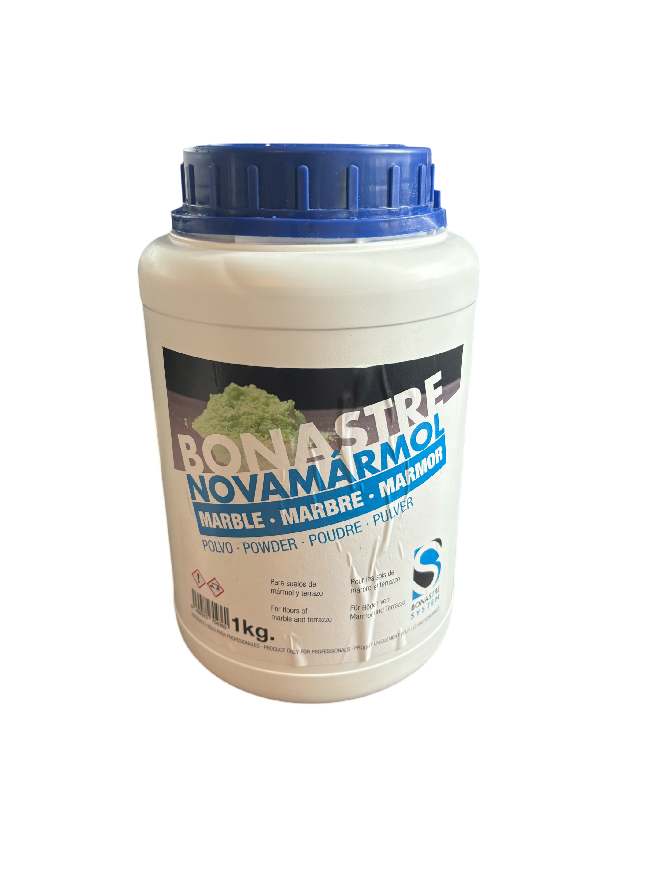 2.- Wet surface. Sprinkle NovaMarmol powder on the floor (1 -2 oz. M2) over an area of about 2.5M2 at a time.