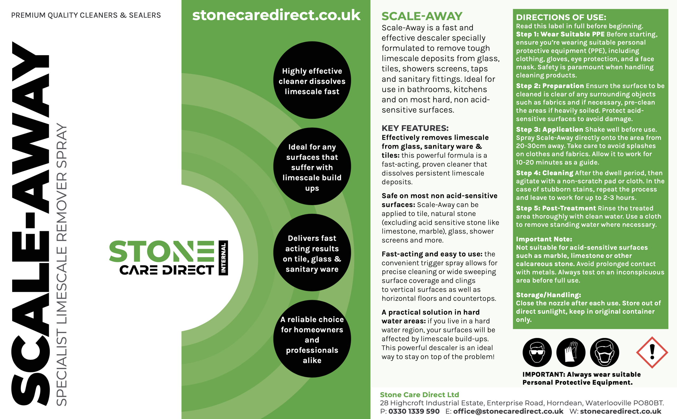 Scale-Away is a fast and effective descaler specially formulated to remove tough limescale deposits from glass, tiles, shower screens, taps, and sanitary fittings. Ideal for use in bathrooms, kitchens, and on most hard, non acid-sensitive surfaces.